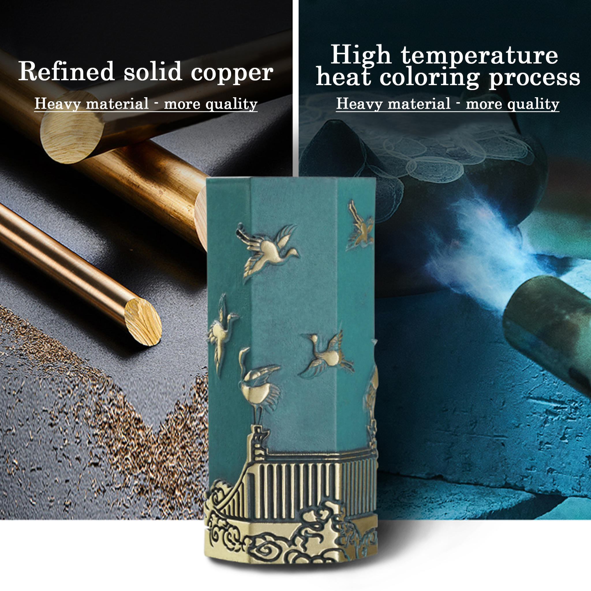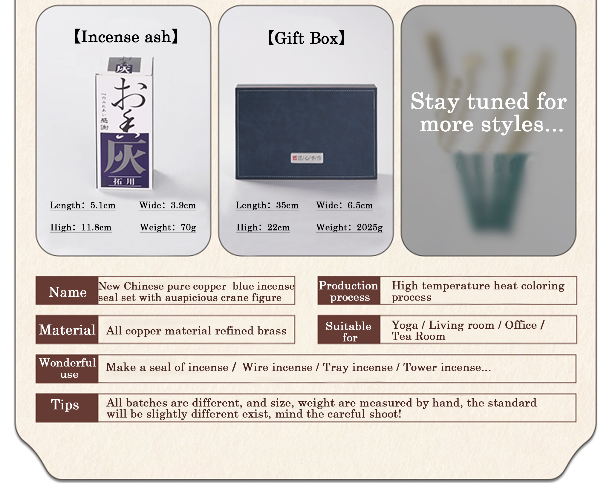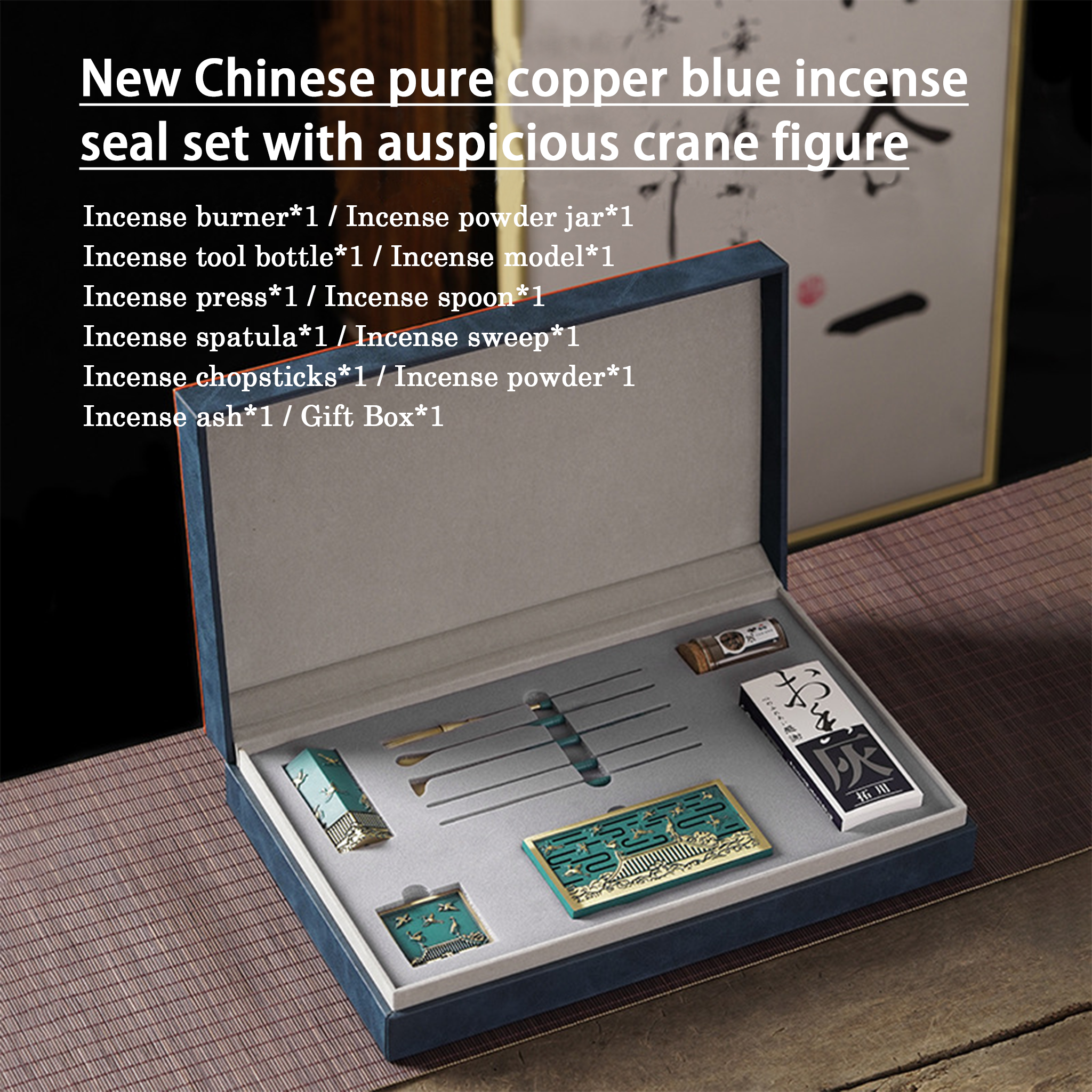 New Chinese Pure Copper Blue Incense Seal Set With Auspicious Crane Figure